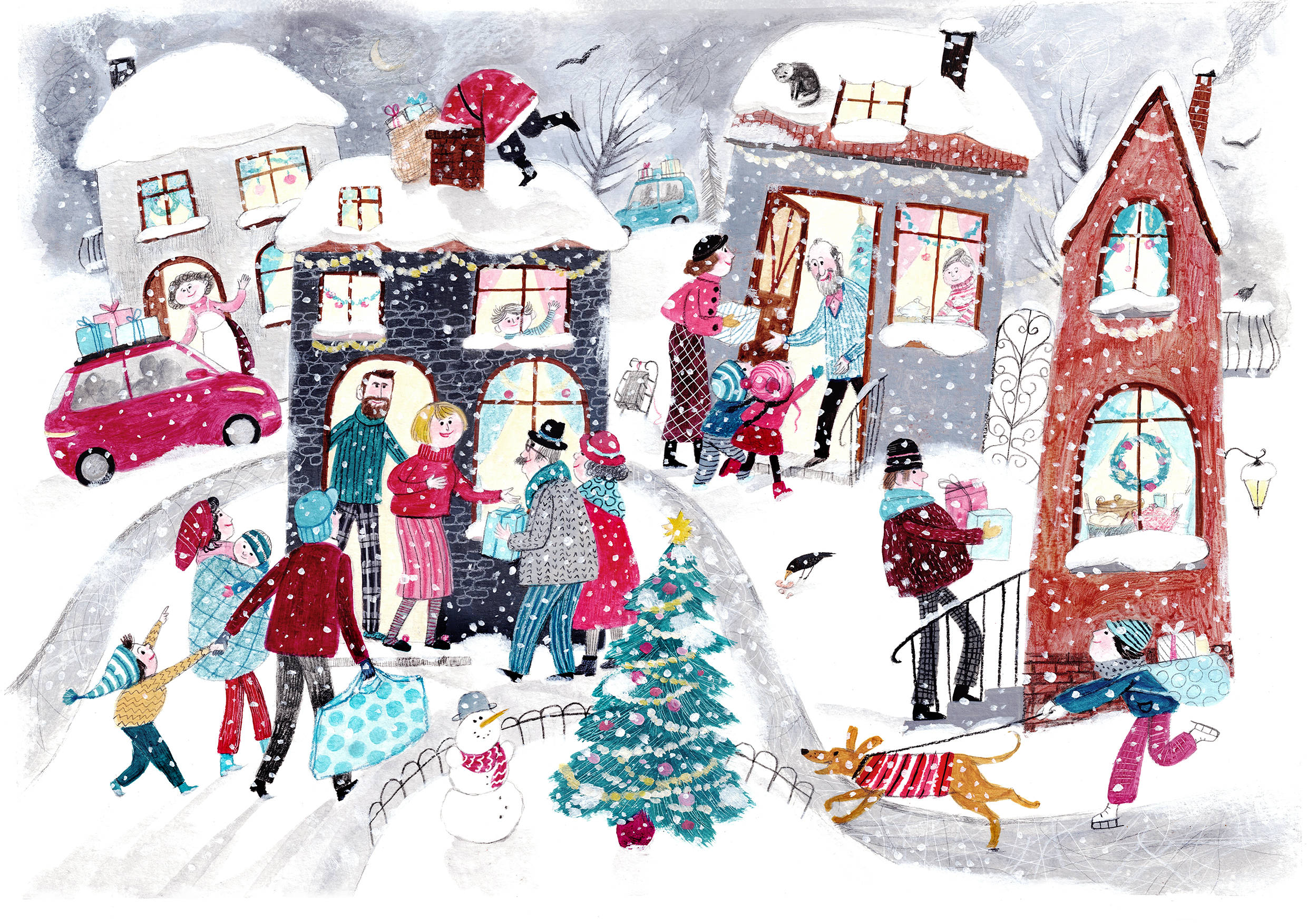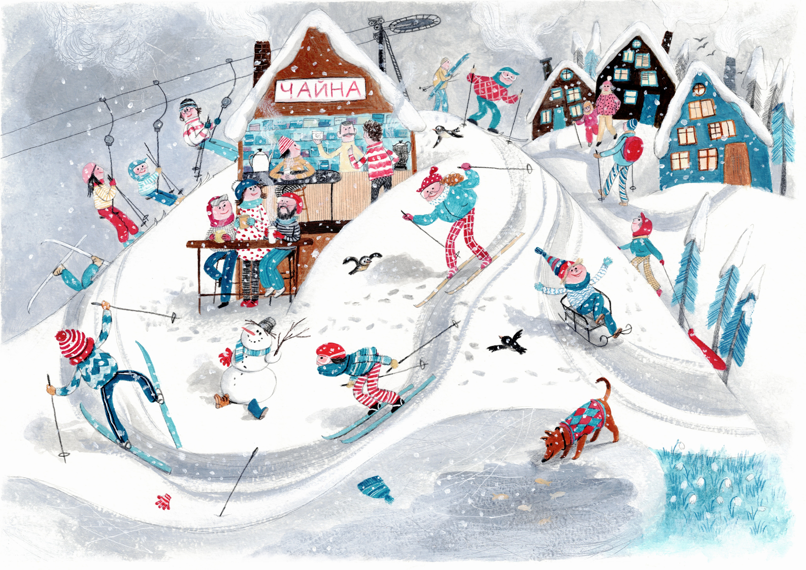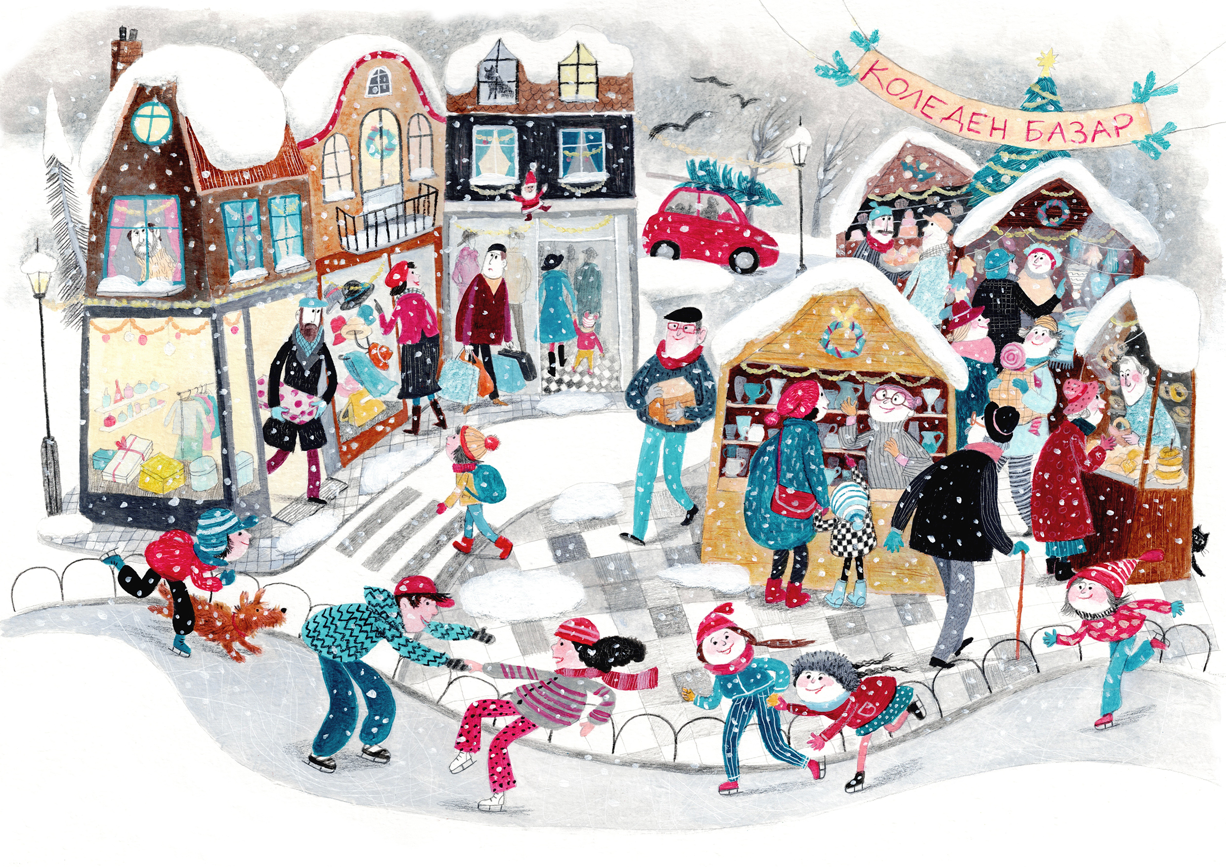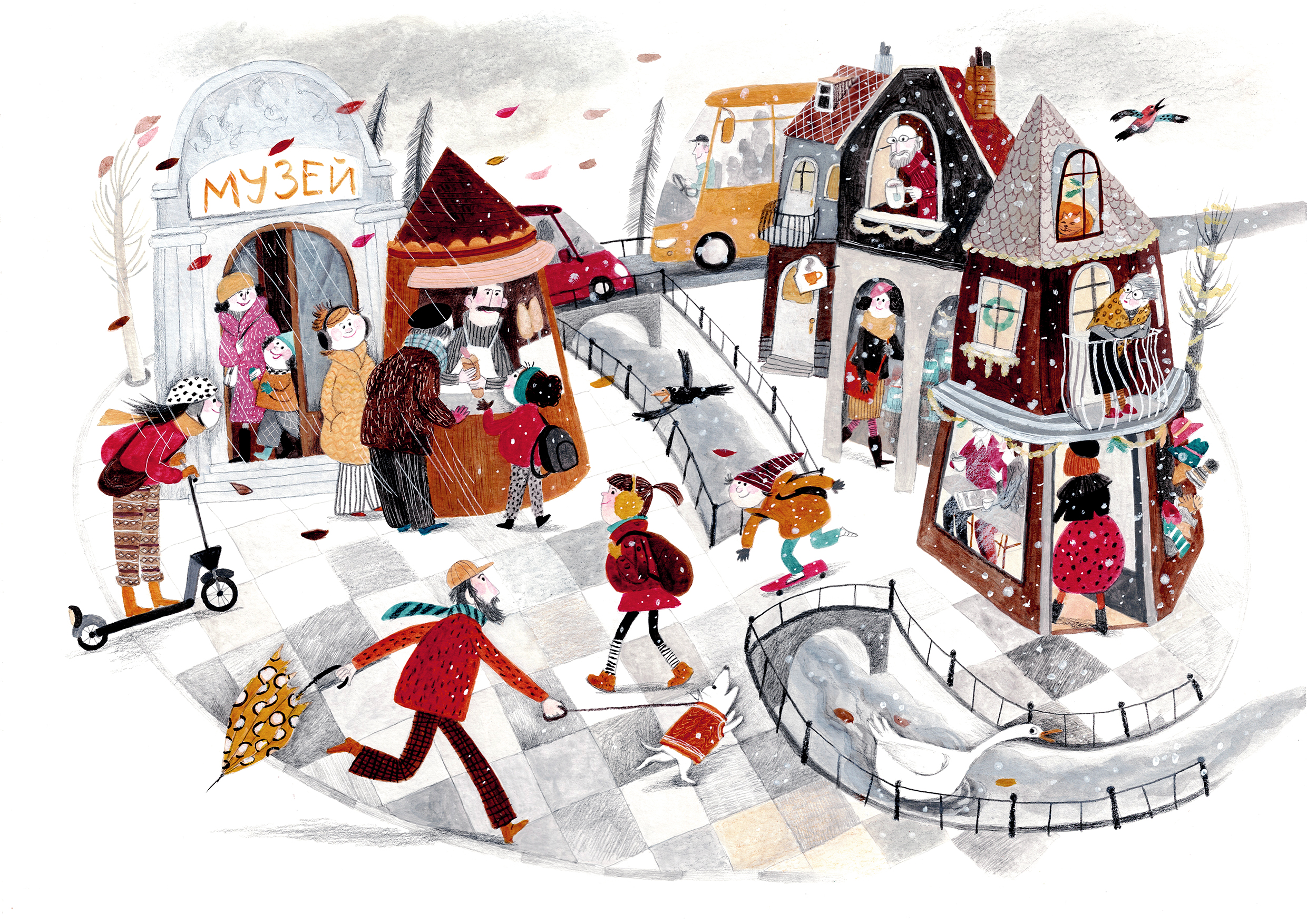 This is a silent leporello book that uses illustrations to tell the story of the transition from autumn to winter, typical of Eastern Europe, the celebration of winter holidays in the city and the life on the farm and in the forest.